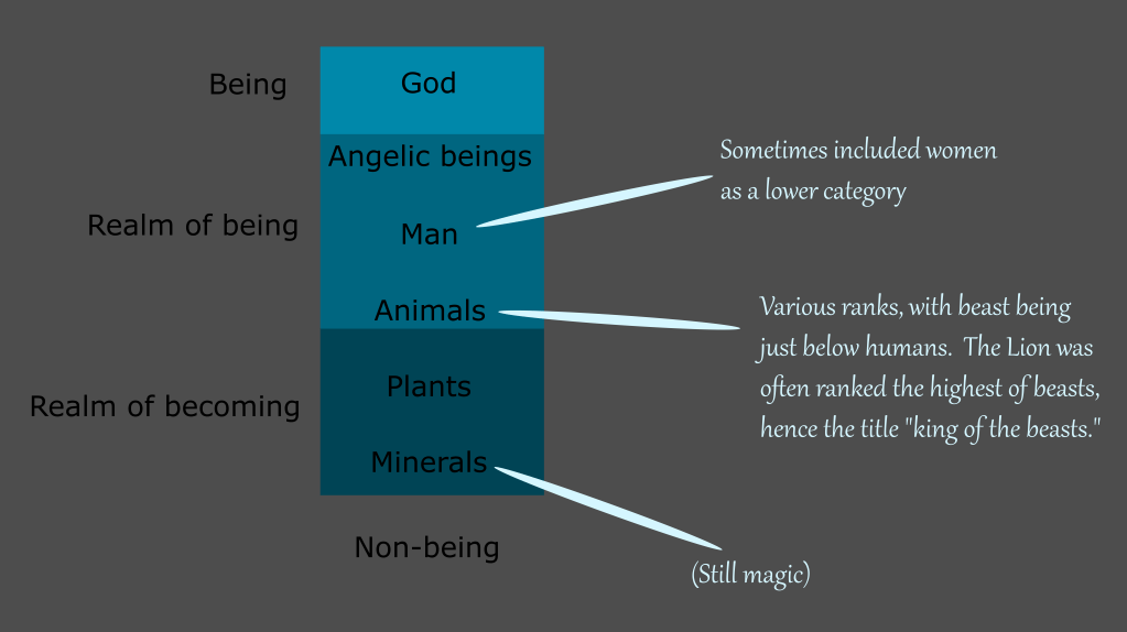 Generally, the more aware and mobile an animal was, the higher it was placed on the ladder, ultimately culminating in man. Similarly, plants were ranked below animals, with flowering plants ranking above “lesser” plants (a grouping which also included fungi.) The bottom of the ladder was made up of the various known minerals and materials and was seen as the lowest form of being, such that everything was part of a spectrum of existence.