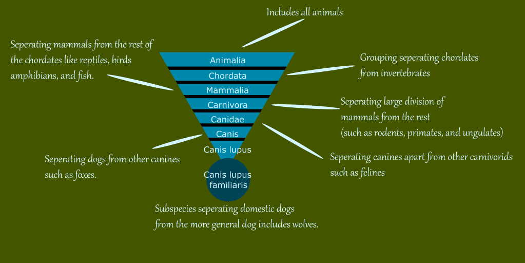 The kingdom splits into animals with, and without a spinal cord. Chordata represents all animals with this feature. Chordata further splits into several groups including reptiles, amphibians, birds, fish and mammals. Mammalia splits into several groups including primates, ungulates, rodents and carnivores. Carnivora splits most broadly into felines and canines. Canidae further divides dogs and wolves from foxes in the genus Canis. The species name Canis Lupus includes both domestic dogs and wolves. The subspecies Canis lupus familiaris denotes our beloved domestic dog breeds.