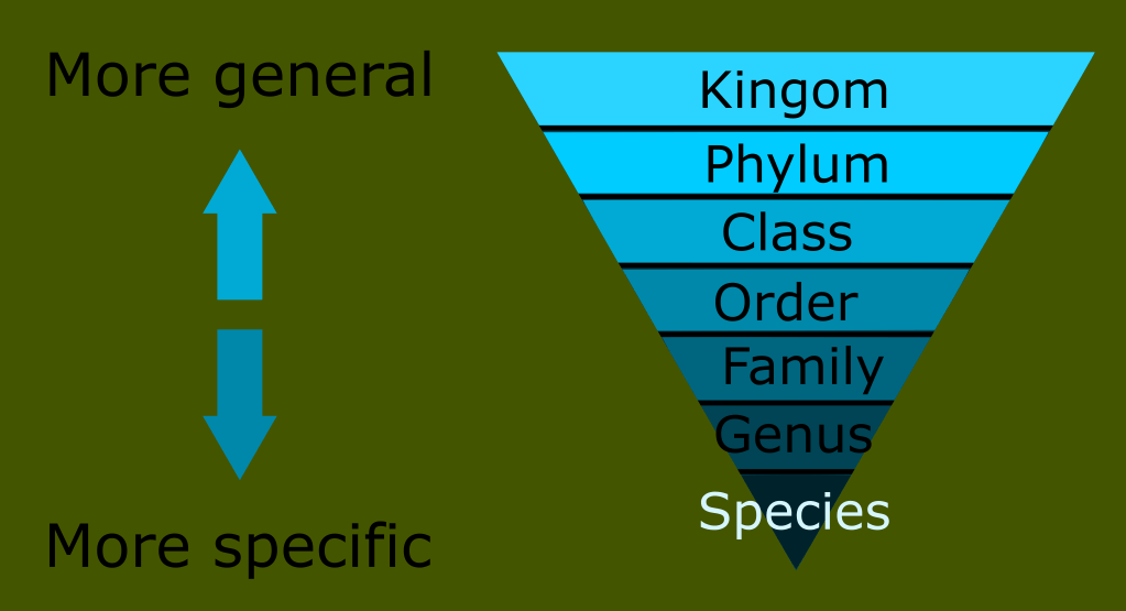 Note that each level becomes progressively more specific, and split into more subdivisions than the last category above it. This upside down triangle is intended to show how Linneaus’ classification works from more general, to more specific to provide a reference point for all groupings.