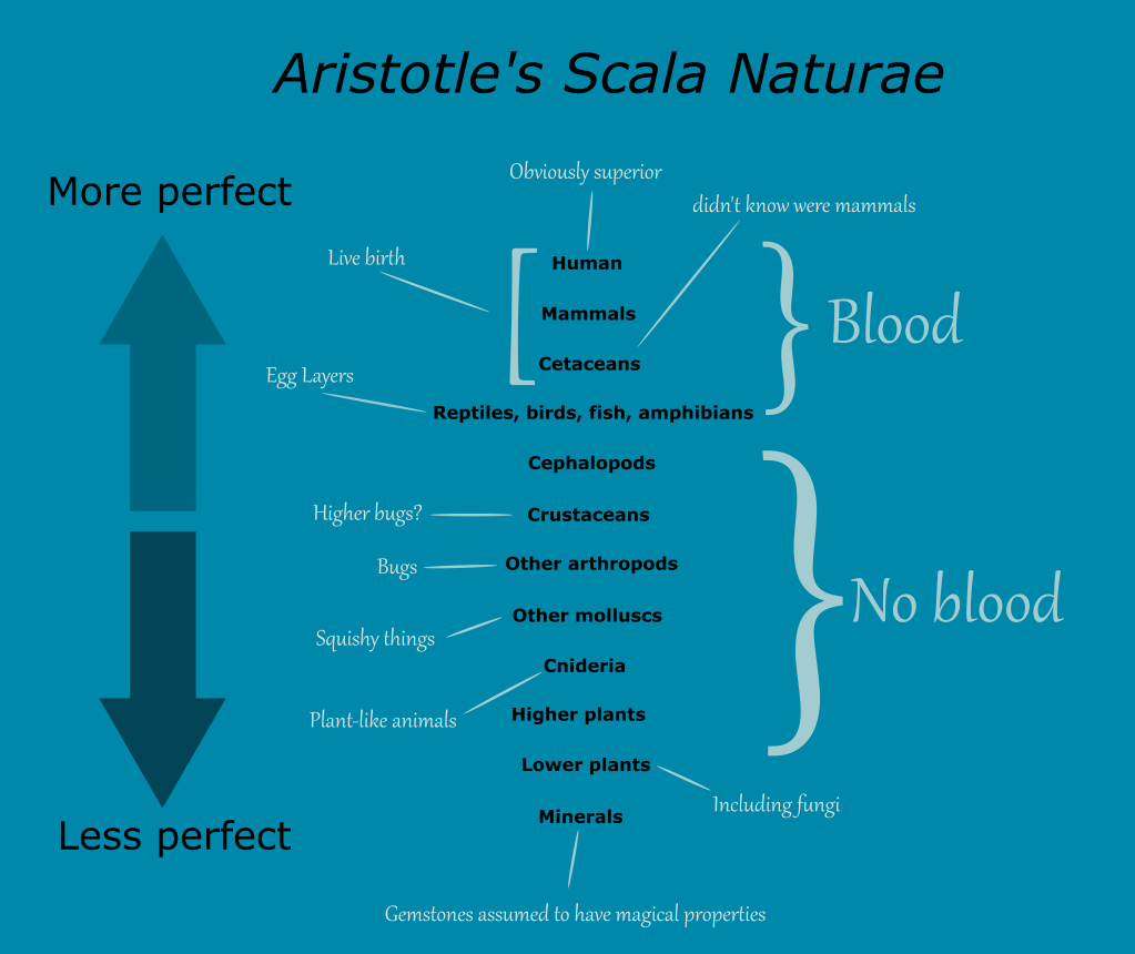 Aristotle developed the concept of ranking the living world vertically according to what he perceived to be “higher” and “lower traits.” This formed the basis of the early status quo for taxonomy, Aristotle’s ladder of nature formally known as Scala Naturae.