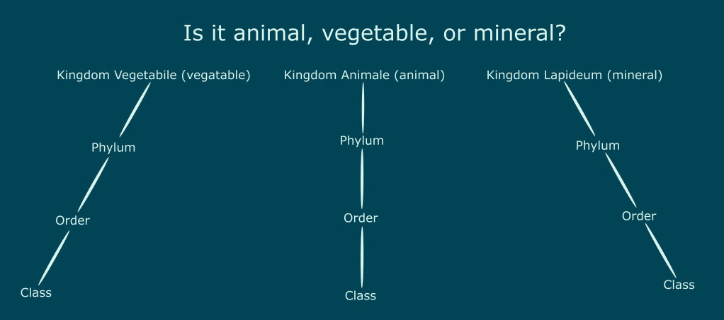 It is important to note that Linnaeus’ approach was fundamentally different than previous ways of thinking about taxonomy. While the great chain of being presented a linear structure of nature, with all creatures being ranked vertically relative to either man or god; Linnaeus’ new paradigm compared organisms to each other in a divergent pattern, thus breaking the artificially conceived linearity in the natural world.